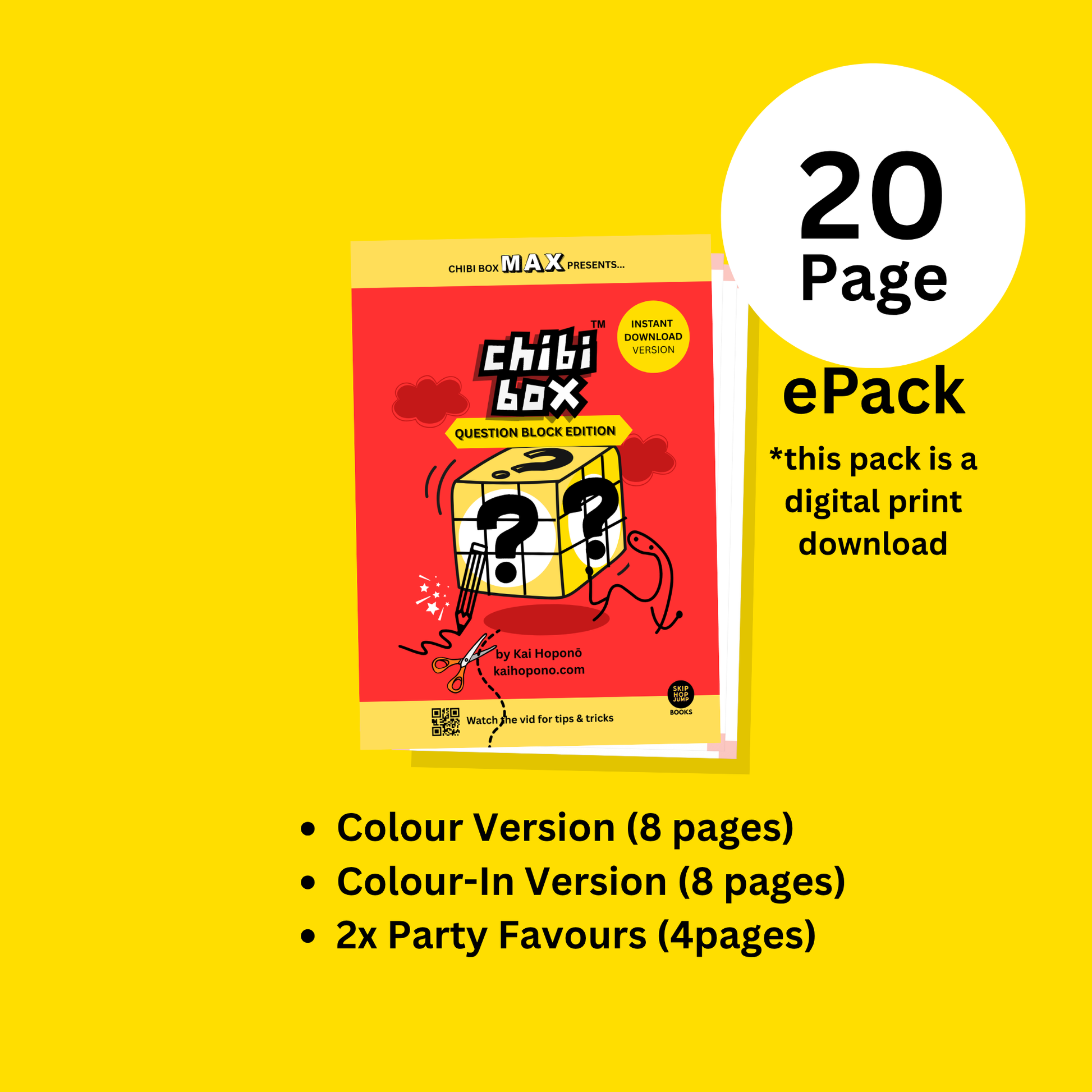 The 20-page ePack is easy to print and make (no glue required!), and includes the colour and colour-in versions (for those who want to personalise their box). As well as 4X bonus 1-page party favour pages that take only a few minutes to make (see photos).